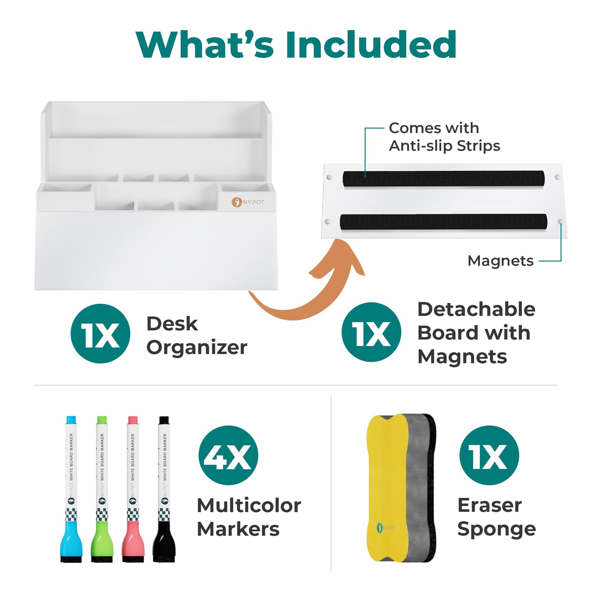 - ACCESSORIES INCLUDED: Comes With 4 Markers And A Dry Erase Sponge For Effortless Daily Use. Pairs Perfectly With The Desk Whiteboard And Dry Erase Desk Organizer To Help You Plan, Write, And Erase With Ease.
